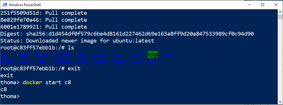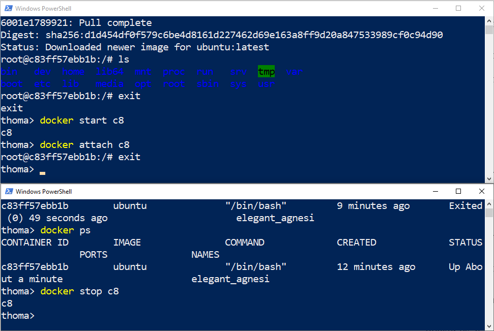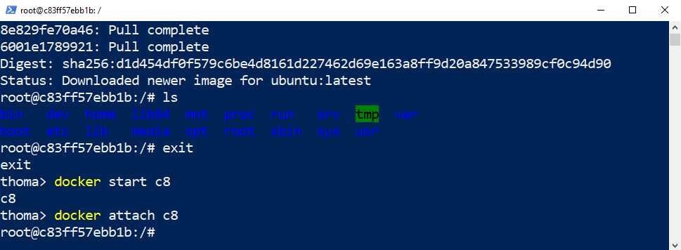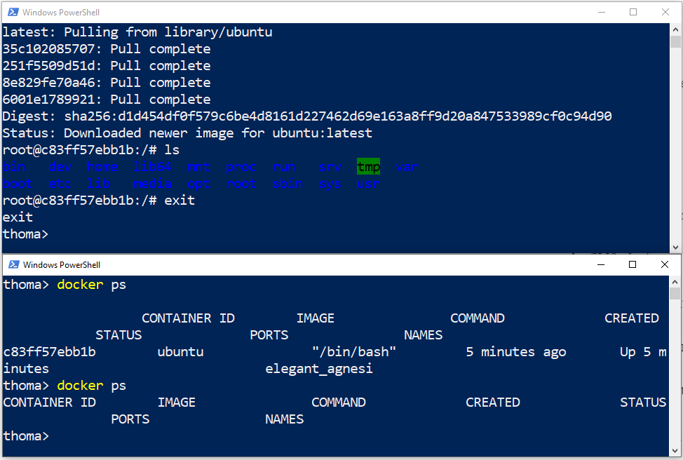 -itinteractive flag so you can use normal bash commands in the Linux container in an interactive way, such asls. Your current command line window gets taken over and attached to the process you started, stdin.
